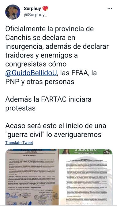Se declararon en INSURGENCIA y la movilización permanente en el distrito de Canchis, Cusco. El Frente Único de Defensa de los Intereses de la P rovincia de Canchis toma esa medida y rechaza la captura del poder ejecutivo por parte de Dina Boluarte. La desconocen como Presidente de la República. Así manifestó Jean Paul Benavente, gobernador de Cusco y Psdt de la Asamblea Nacional de Gobiernos Regionales (ANGR).