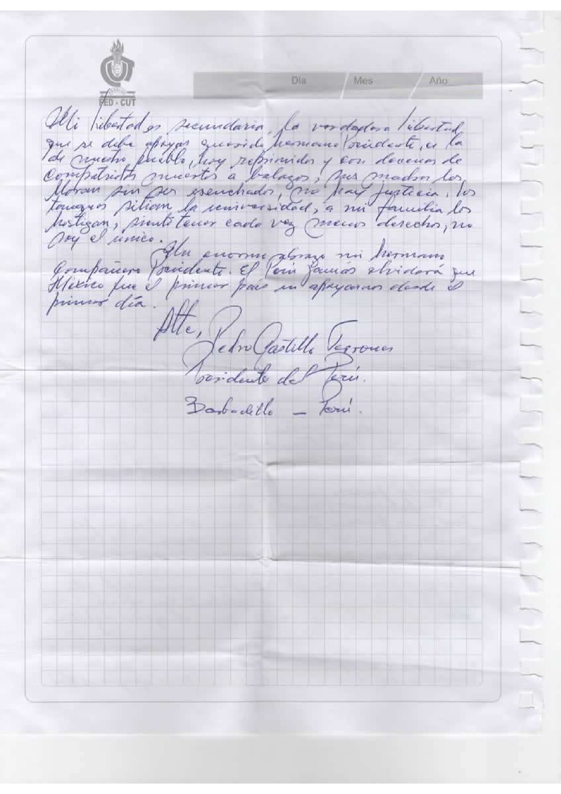 Carta del presidente Pedro Castillo al presidente de México AMLO desde el penal Barbadillo