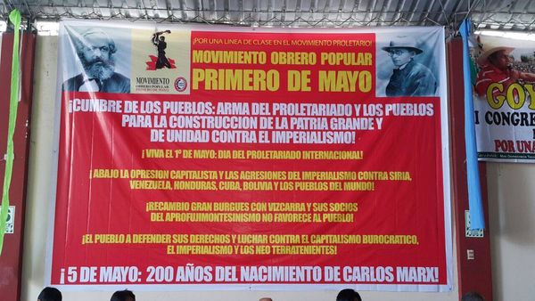 - CONVOCAMOS a luchar y defender nuestros recursos naturales, la educación pública y gratuita, soberanía nacional, la madre tierra y la defensa de los derechos ancestrales de los pueblos originarios y las conquistas y derechos sociales del proletariado y el pueblo. La lucha por el empleo, el trabajo y salario digno, la seguridad social, las pensiones, la negociación colectiva, la sindicalización, el derecho de huelga, la libertad sindical, salud ocupacional, los derechos económicos y sociales, el respeto a los migrantes y afro descendientes, urge lucha contra la nueva forma de saqueo de recursos con el extractivismo, las asociaciones público privada y obras por impuestos- fuente de sobrevaloración, entreguismo y corrupción; la erradicación del trabajo infantil y esclavitud laboral de estudiantes, libertad de los presos políticos; y en general, toda opresión y explotación del sistema capitalista en toda nuestras naciones.