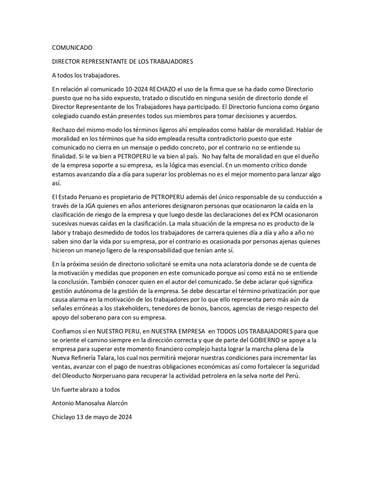 Señala también que, como es el sentir de los trabajadores de PETROPERU, el no está de acuerdo con la privatización de PETROPERU S A.