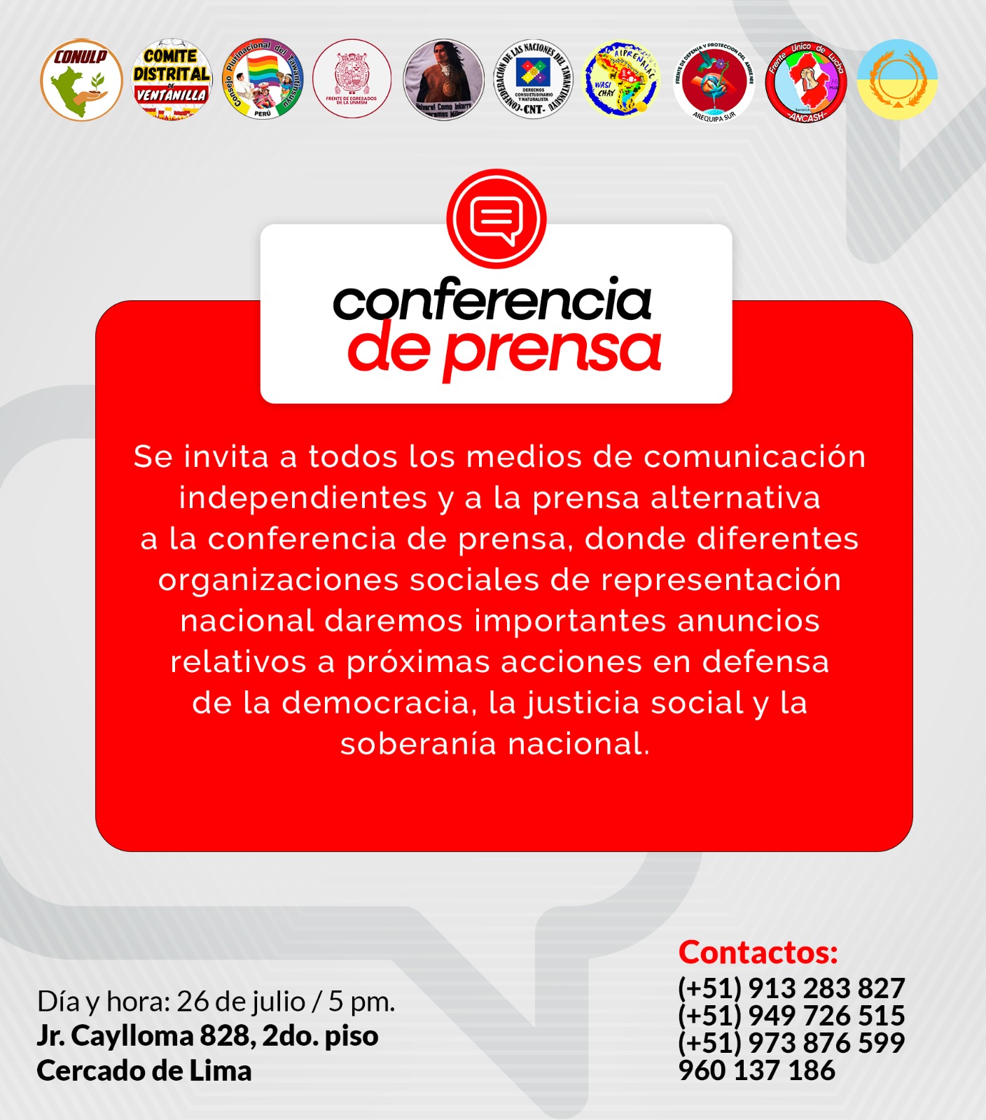 Perú: Conferencia de Prensa el 26 de julio – 5 pm en Lima