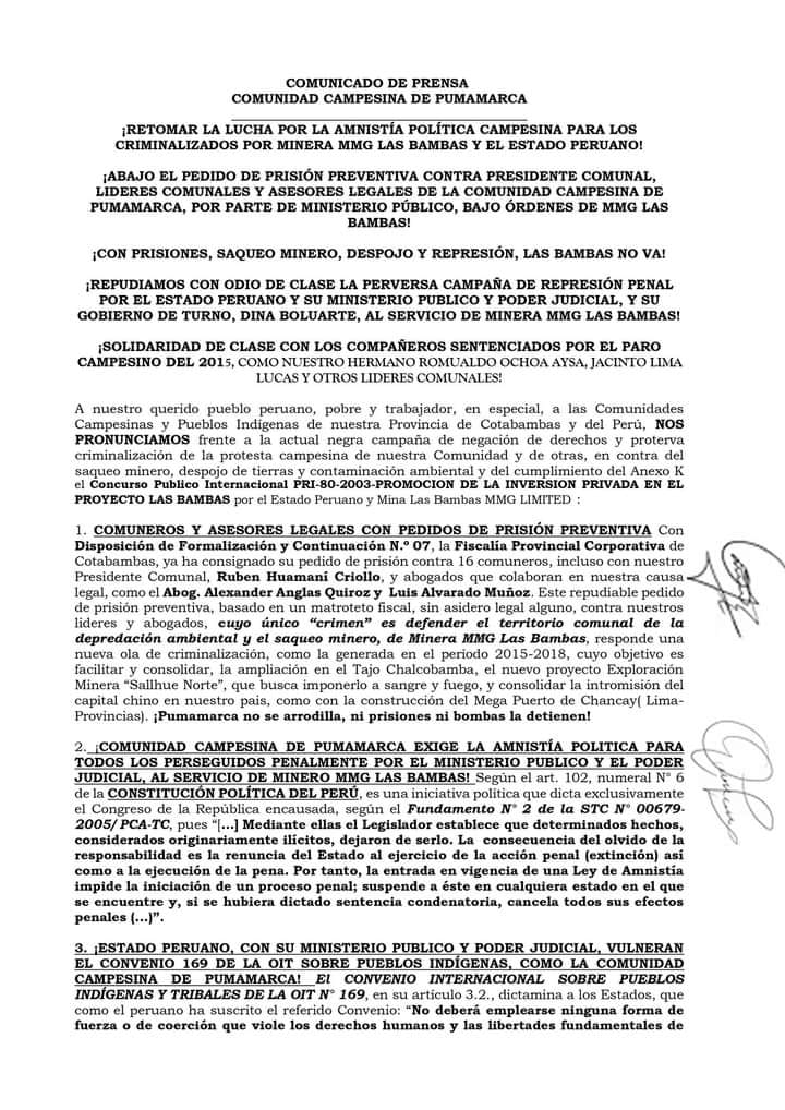 Frente a la nueva ola de persecución política y criminalización por minera MMG Las Bambas y el estado peruano, con el ministerio público y poder judicial bajo sus órdenes, la Comunidad Campesina de Pumamarca exige la promulgación de una ley de amnistía política, para barrer con las denuncias, pedidos de prisión y sentencias.