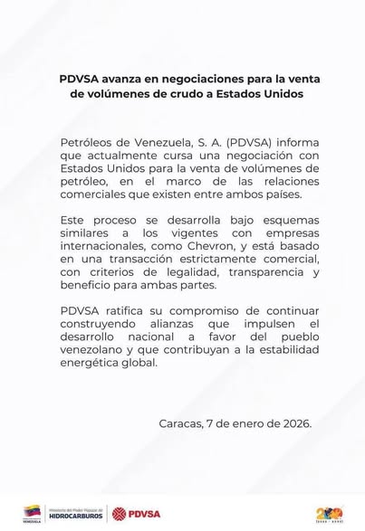 Por otro lado, la petrolera estatal venezolana PDVSA si bien hoy anuncia que está negociando venta de petróleo con EEUU, esto no debe sorprender pues los imperialistas han tenido varios años en sanción económica a Venezuela impidiéndole comercializar petróleo.